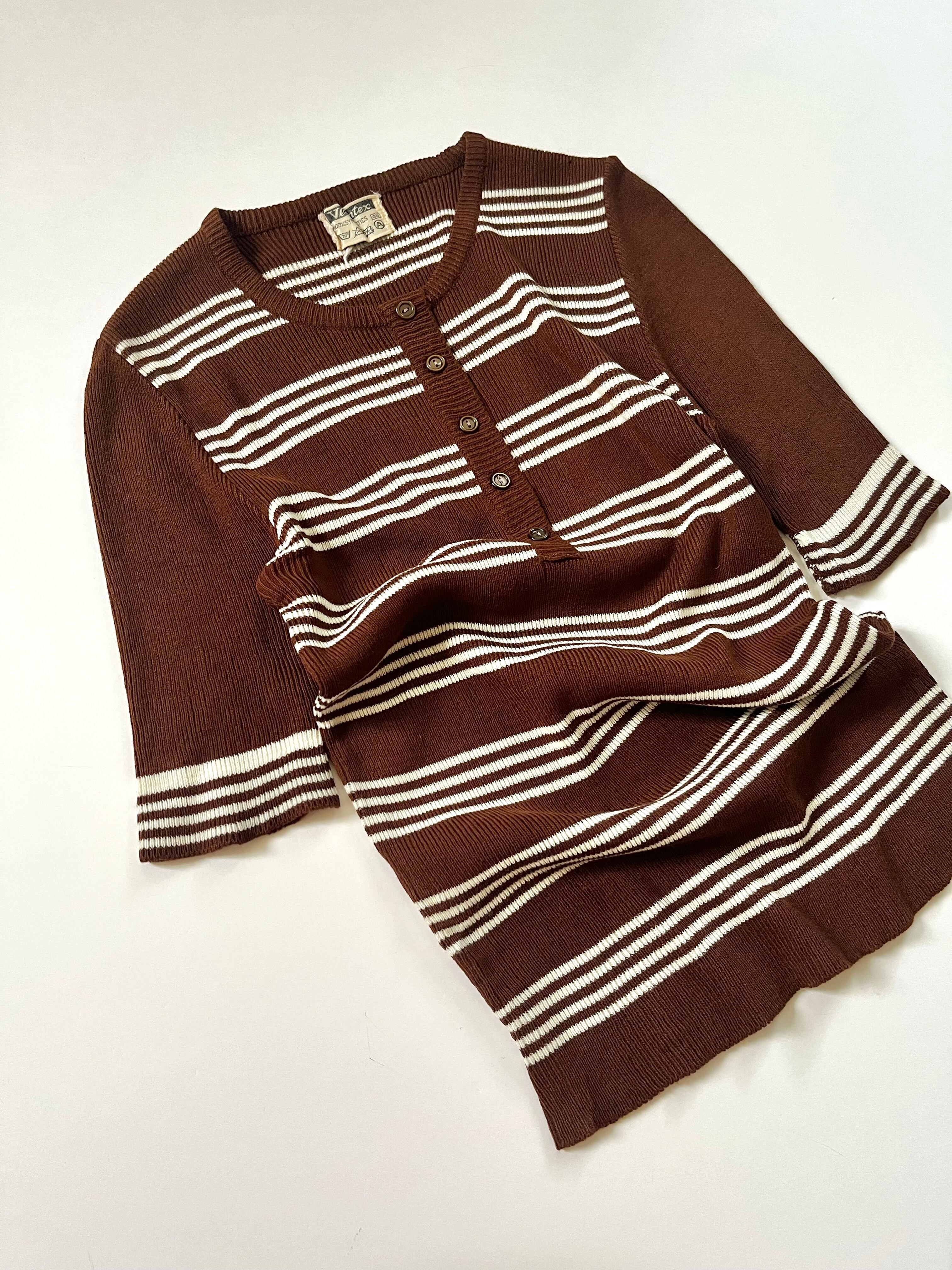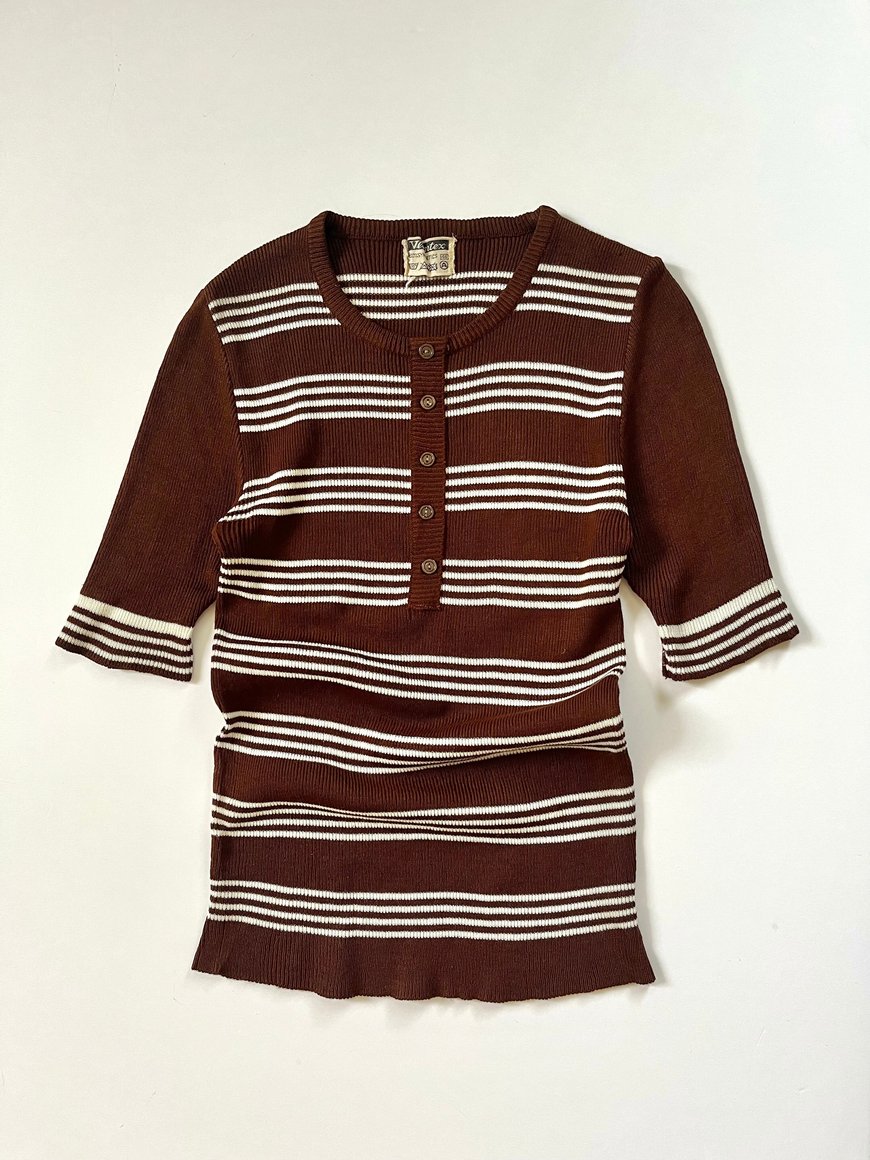 70-80s' euro リブボーダー5分袖ニット ブラウン