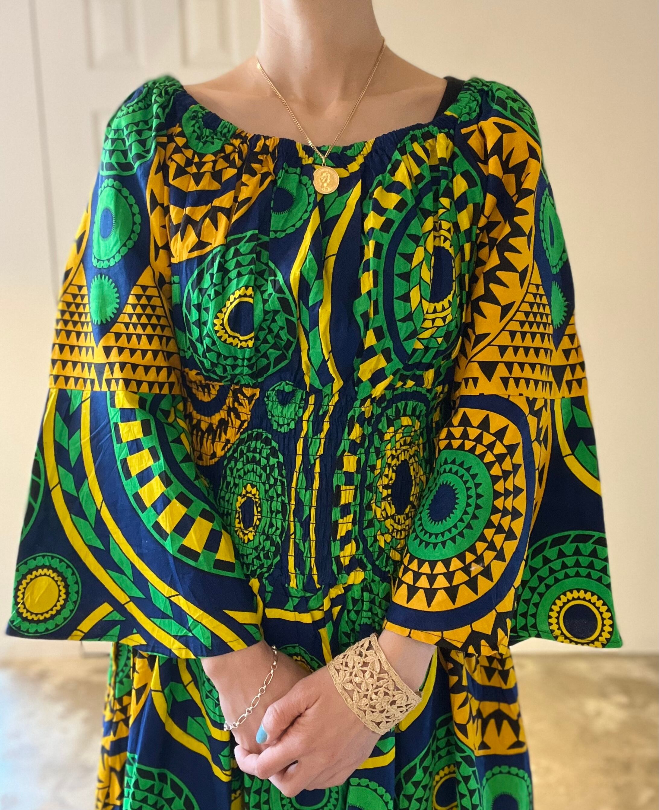 AFRICAN BATIK ウエストシャーリングベルスリーブワンピース