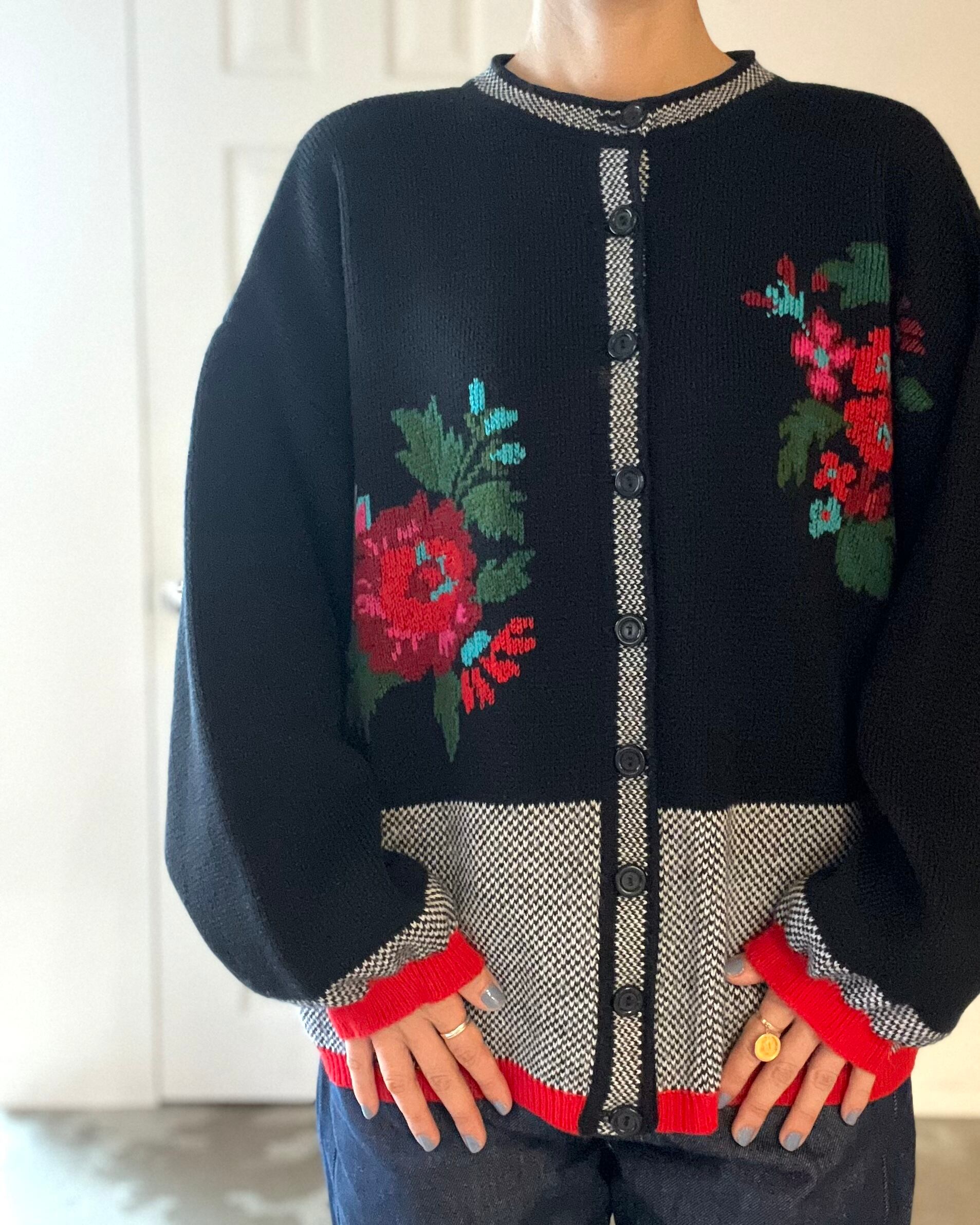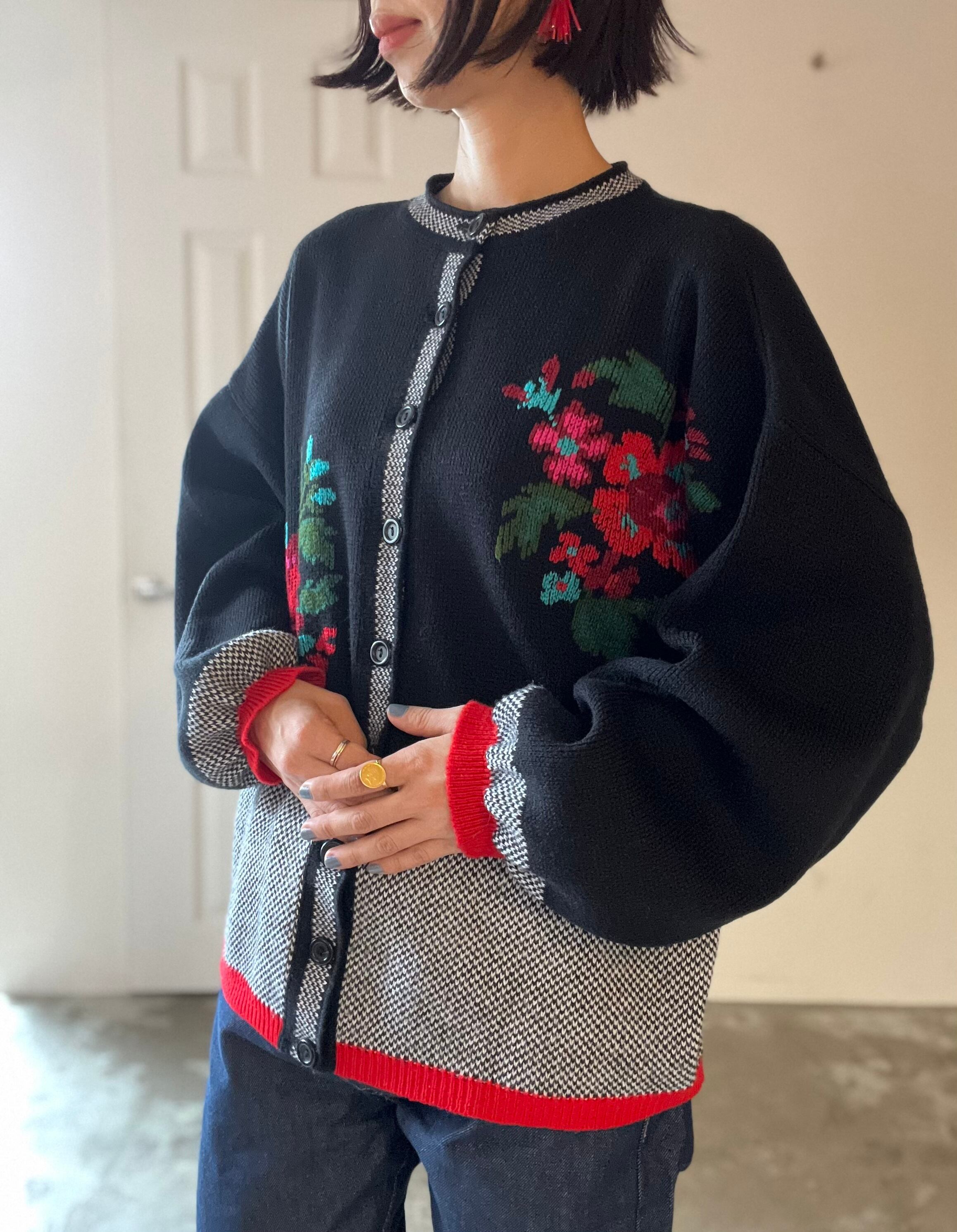 ハーフミラノ編み お花 刺し子手刺繍ニットカーディガン