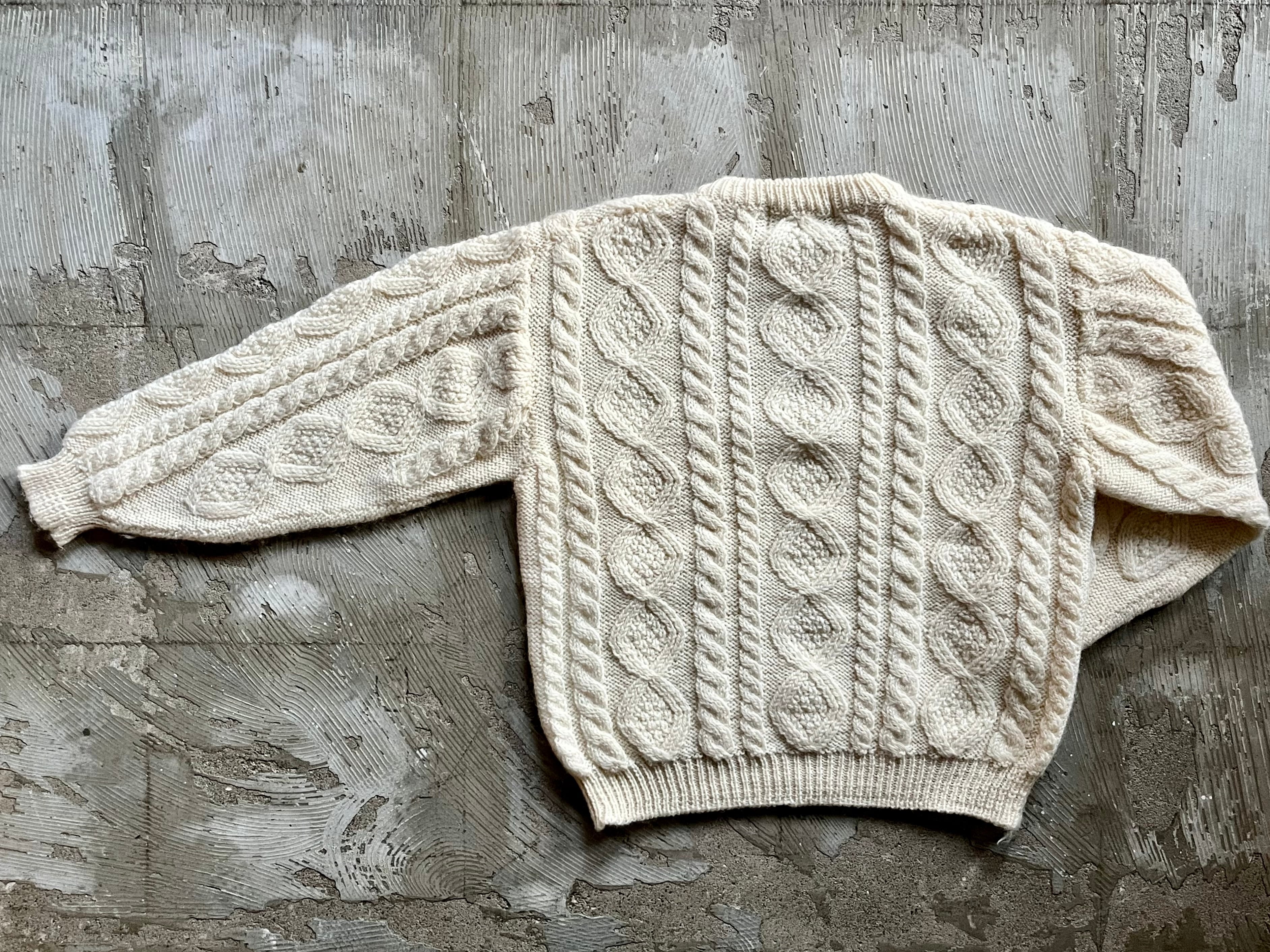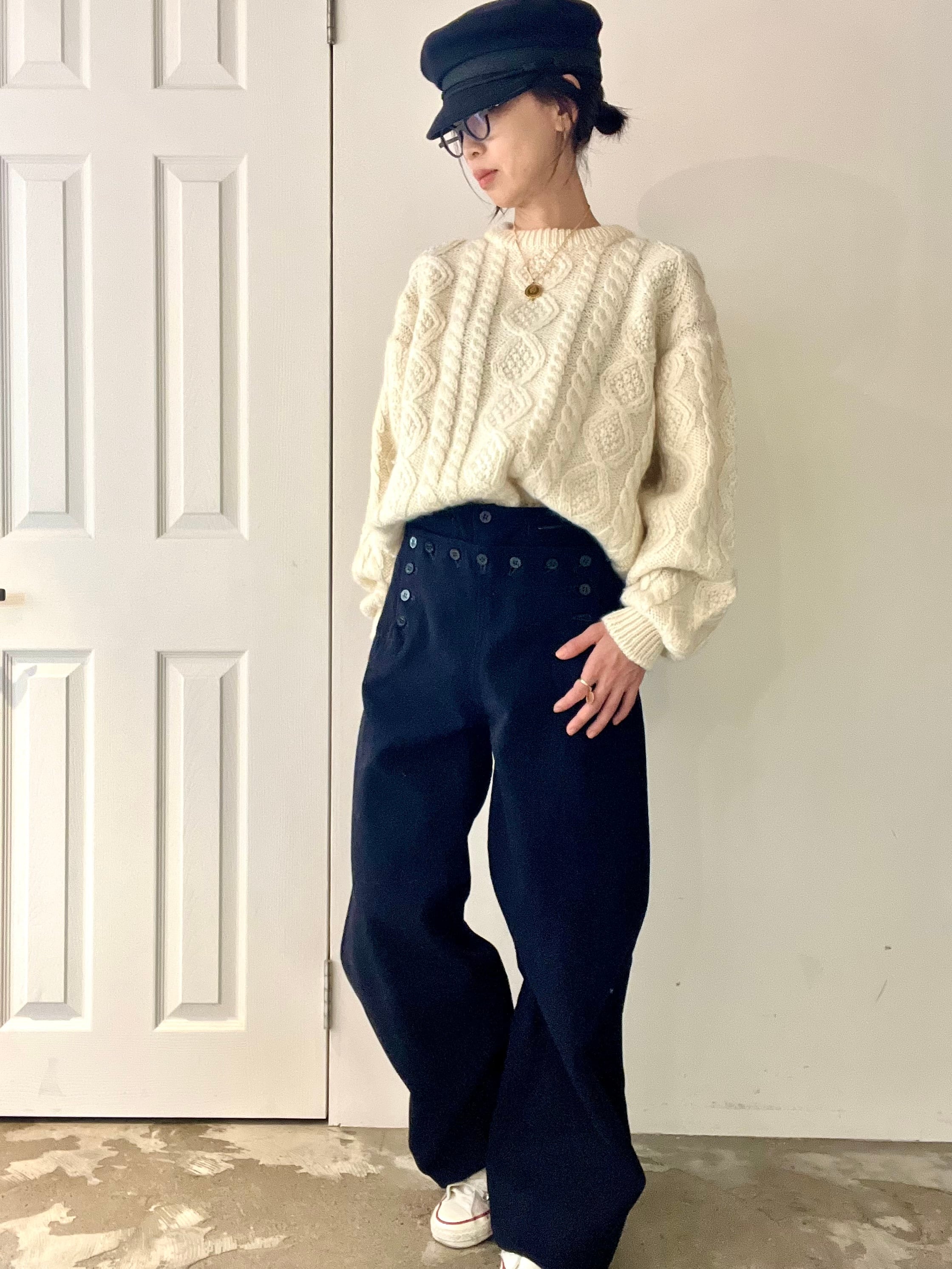 ローゲージすぎず程よい肉感のアラン編みセーター。パンツインスタイルにもお使いいただけます。(着画では前だけウエストインしています)